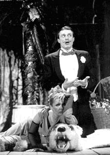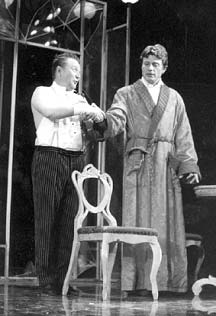 - Анатолий, лично вы дружите с компьютерами и вообще с современной техникой? - Нет, не очень, я этим не увлекаюсь. - Когда влюбленная в Джерома Зоя - Татьяна Аугшкап догадывается, что он синтезирует, то есть преобразует в музыку записанную им на магнитофон ночь их любви, она бросает ему в лицо: "Извращенец! Тебе никогда не написать музыку о любви!" Вы согласны с этой жестокой репликой? Зоя права? - Права. Как ни печально, но права. В общем спектакль об этом. О том, что, не имея чувства внутри, в сердце, в душе, выразить что-либо в творчестве, наверно, невозможно. С точки зрения нормальной логики, она, конечно же, права. - И все-таки ваш Джером творческая личность, он настоящий композитор? - Безусловно. Безусловно. - В спектакле роботы добрее людей, а люди роботизируются, теряют лучшие душевные качества. Дочь вашего героя Джейн готова скорее расстаться с родителями, чем с няней-роботом. Эту метафору вы не станете отрицать? - Этот перевертыш есть в спектакле. Но опять-таки я подчеркиваю, что это обычный комедийный драматургический ход, не более того. Никакой глубокой философии в этом искать не стоит. Написана комедия. Обыкновенная комедия. Даже при достаточно серьезной теме, при той глобальной проблеме, которую можно там найти, это комедия, и ни в какие глубины драматург Эйкборн не забирался и целей перед собой таких не ставил. Эта пьеса идет в Лондоне в театре "Водевиль". Само название театра определяет репертуар и жанр, в котором они работают. В общем это почти комедия положений. Поэтому разговор может идти только о том, что зритель видит на сцене, что из этой комедии положений сотворил режиссер Леонид Ефимович Хейфец. - От ваших партнерш Ольги Прокофьевой и Татьяны Аугшкап потребовались новые краски и приемы, чтобы сыграть нянь-роботов. А вам пришлось задевать какие-то неизведанные душевные струны для роли Джерома?